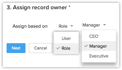 - 在分配记录所有者选项, 转至分配依据,然后从下拉列表中选择用户、职位或分配规则。