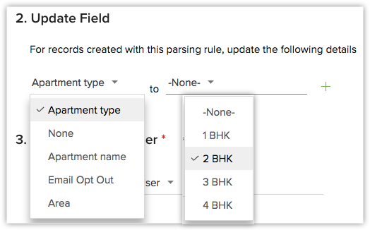 可选择使用解析方法来更新将在 CRM 中创建的记录的字段。例如,您已设置通过解析方法创建的所有记录用于特定公寓。在此情况下,您可选择在向 CRM 添加记录后自动更新公寓名称。