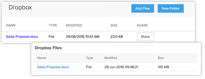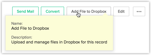 Dropbox 是最受欢迎的工具之一,它简化了在任何地方创建文档并与任何人共享和实施协作的过程。 开展任何业务都需要共享的文件和 Zoho CRM 扩展从而让您可以在 Zoho CRM 内访问您的 Dropbox 文档。 利用此扩展,您可以直接从 Zoho CRM 上传文件到 Dropbox。 这些文档可作为附件发送,也可作为来自 Zoho CRM 的链接共享。 当您安装此扩展时,您将在每个联系人和线索详细信息页面中得到 Dropbox 文档相关列表,在此等列表中将列出该特定记录相关的所有文档。