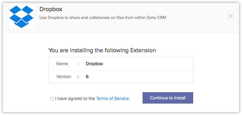 您可以转到Zoho 市场并安装 Dropbox 扩展或登录您的 Zoho CRM 账户进行安装。