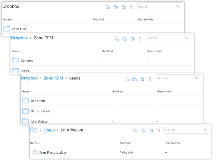 您可以从 Zoho CRM 在 Dropbox 中查看并共享文档。 使用 Dropbox 扩展,您还可以直接从 Zoho CRM 上传文档到 Dropbox。