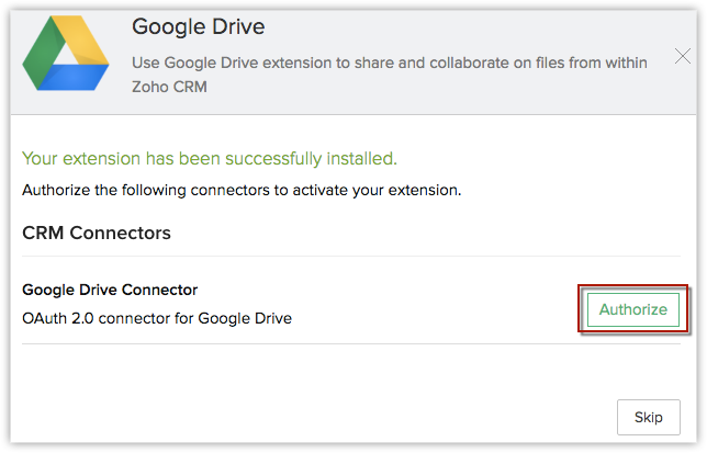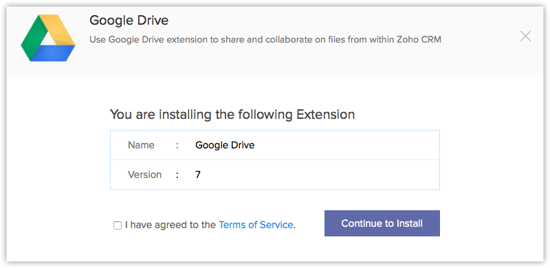 您可以转到Zoho 市场并安装 Google Drive 扩展或登录您的 Zoho CRM 账户并安装。