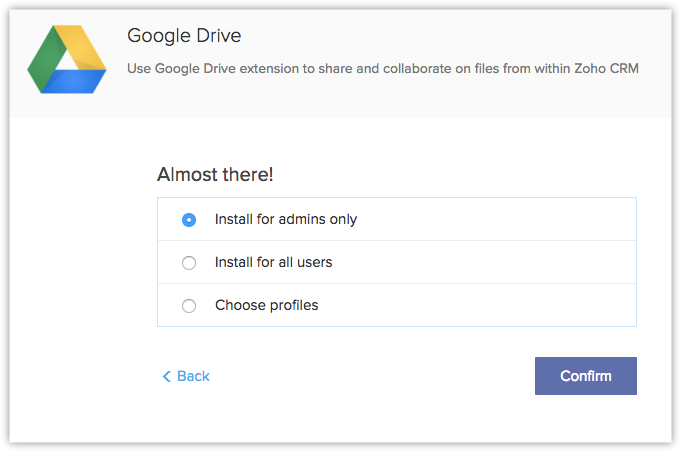 - 为所有用户安装 - 扩展将为所有用户在 CRM 中安装。 用户需要有 Google Drive 账户才能使用此功能。