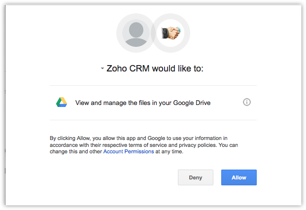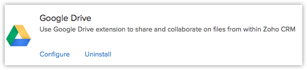 - 授权访问 Zoho CRM 从而与 Google Drive 同步,这样您可以上传您的 CRM 中的文档并与您的 Google Drive 账户共享。
