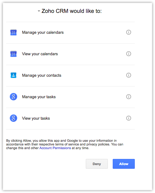 - 允许访问 Zoho CRM 从而与您的 Google Apps 同步,这样您可以从您的 Google Apps 账户对您在 CRM 中的联系人、活动和任务进行同步。