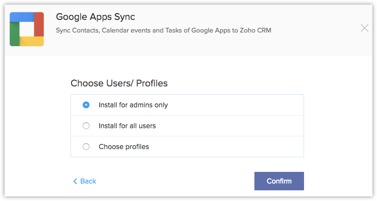 - 为所有用户安装 - 扩展将为所有 CRM 用户安装。 用户需要有 Google Apps 账户才能使用此功能。
