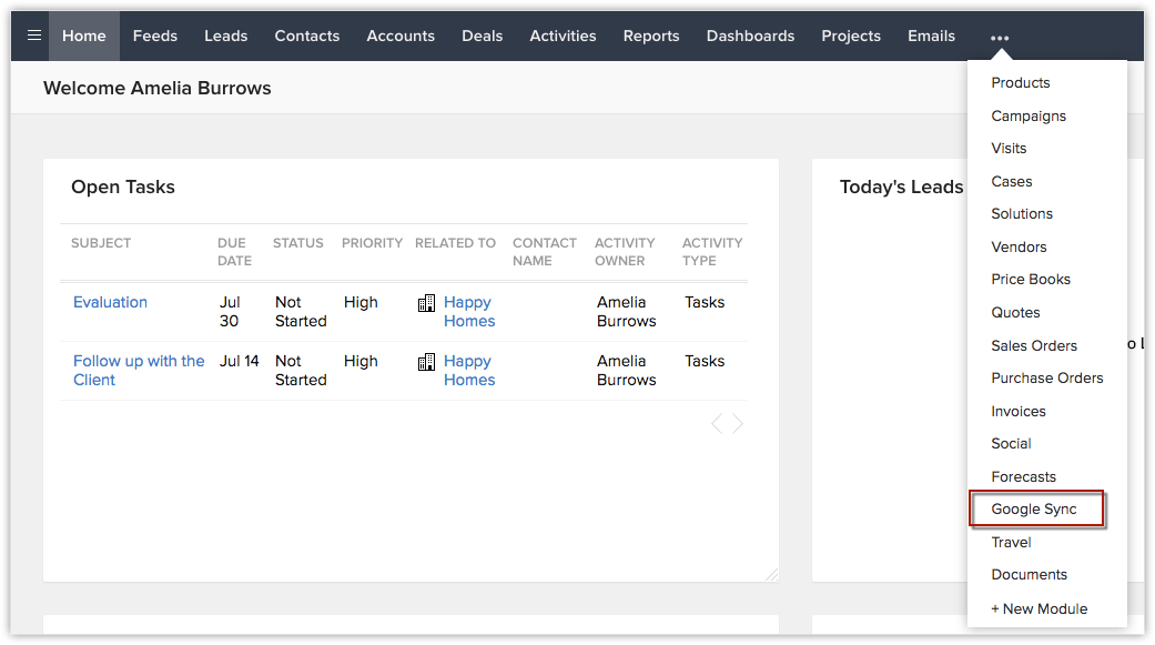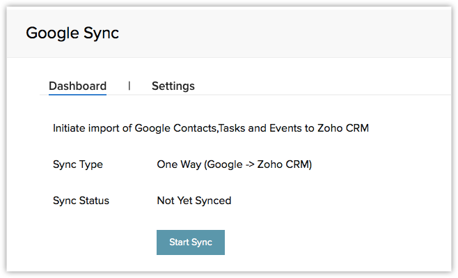 可用的联系人、任务和活动现在可以同步到您的 Zoho CRM 账户中。 一旦同步完成,Google 联系人、活动和任务将在对应的 CRM 模块中可用。