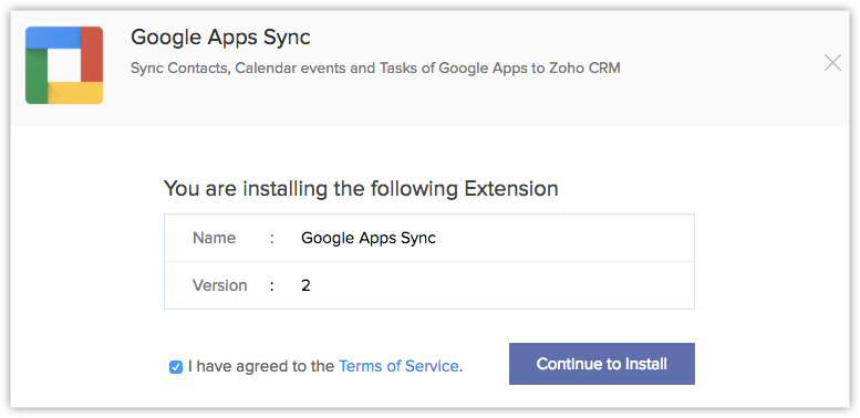 您可以转到 Zoho 市场并安装 Google App 扩展或登录您的 Zoho CRM 账户并安装。