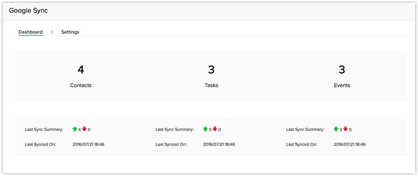 - 您也可以查看同步到 Zoho CRM 的所有联系人、任务和活动列表。 Last Sync Summary = 同步中添加(上箭头)和删除(下箭头)的文档数量。 您也可以查看最近同步的日期。