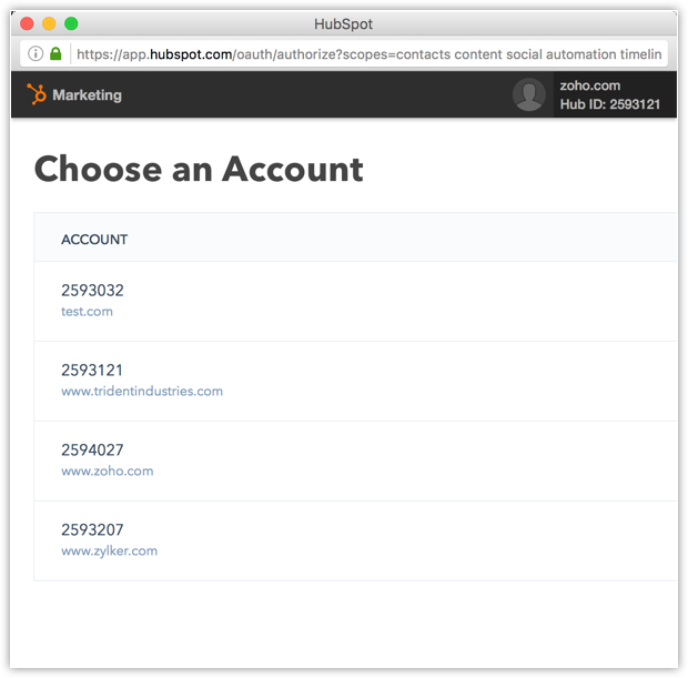 或者,点击注册并创建新账户。 您的新账户将自动得到授权。 - 您点击授权时,您会重定向到 选择账户页面,在该页面中您必须选择必须与 Zoho CRM 关联的用户账户。