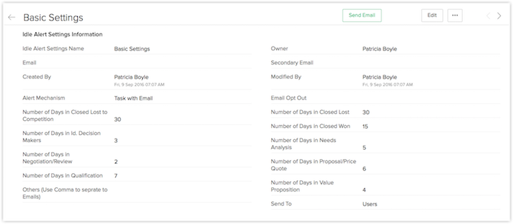 例如,当交易处于商谈 阶段时,如果您想要在每个第五天、第十天和第十五天收到警报,您可以在 闲置警报设置选项卡中创建单独记录,同时 商谈阶段的值分别设置为 5、10 和 15。