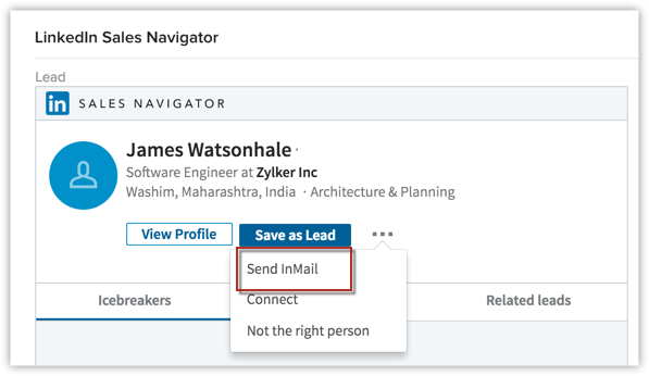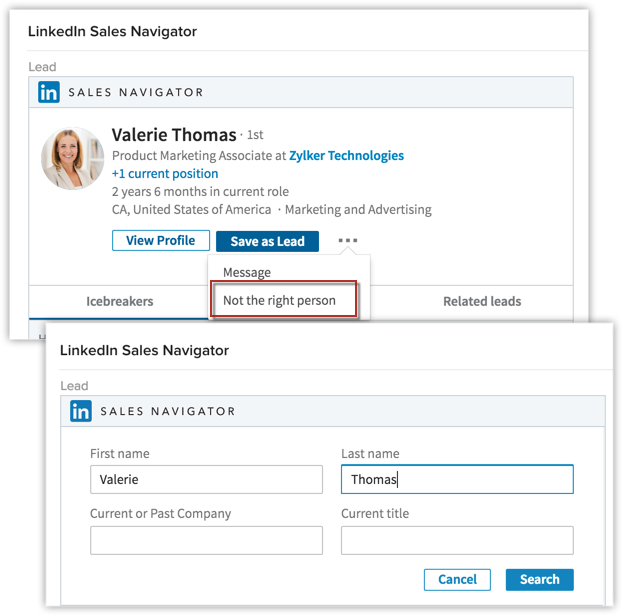 此 CRM 线索现在会作为 LinkedIn 线索立即保存到您的 LinkedIn Sales Navigator 账户中。从那时起,您可以在 LinkedIn 中跟进线索。 - 如果显示的线索/联系不是您要寻找的人,只需单击更多 > 不是正确的人。