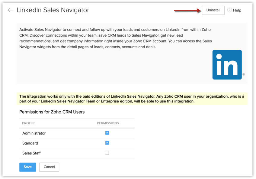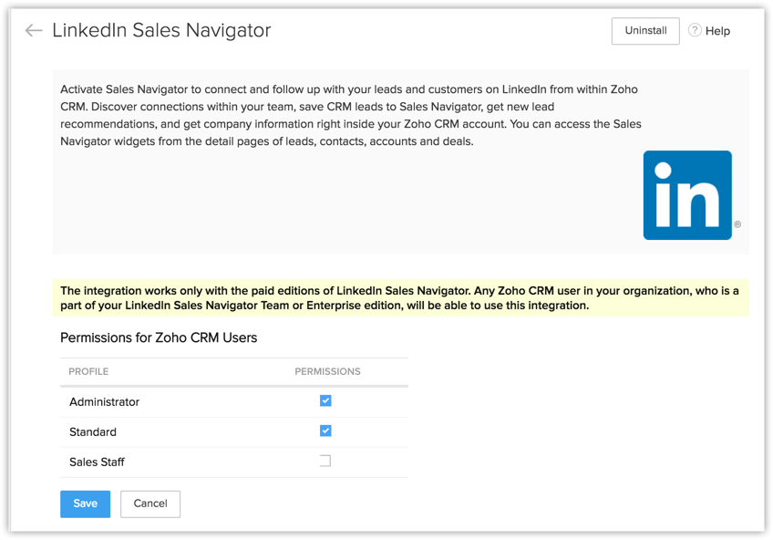 请注意,您需要使用 LinkedIn Sales Navigator 的团队或企业版才能激活此扩展。 - 在 LinkedIn Sales Navigator 页面中,根据需要为 Zoho CRM 用户设置权限。