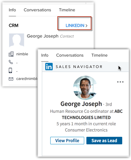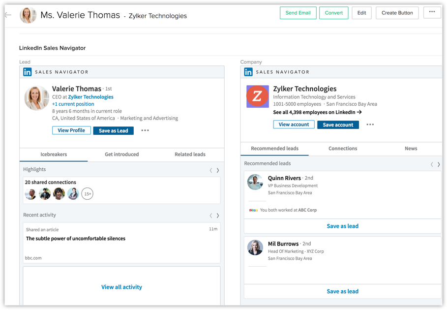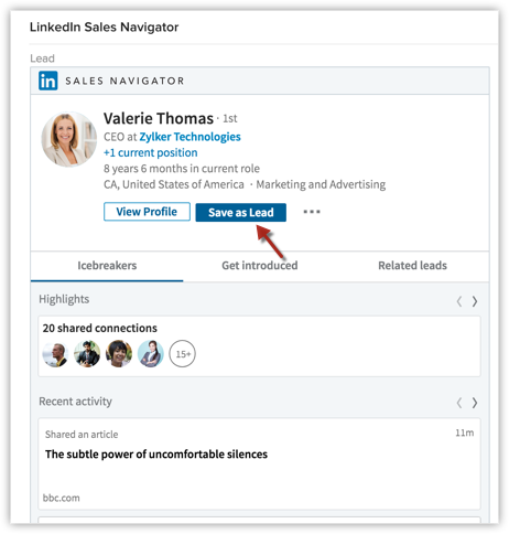 激活 Zoho CRM 的 LinkedIn Sales Navigator 时,您可以将线索、联系人和客户推送到您的 Sales Navigator 账户,并进一步了解有关客户在 LinkedIn 上的专业圈子和活动的信息。