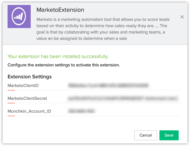 如果您跳过此步骤,之后您可以从扩展详细信息页面授权扩展。 - 提供您的Marketo 客户 ID、Marketo 客户密钥 和Marketo Munchkin 账户 ID 并点击保存。
