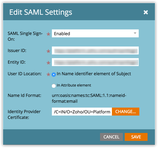 - 在编辑 SAML 设置页面,提供发行商 ID 和实体 ID。 对于 Zoho CRM 而言,两个值都相同,皆为 Zoho CRM 中身份提供商信息部分中可用的登录 URL。