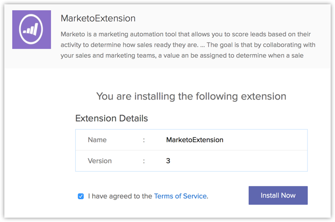 您可以转到Zoho 市场并安装 Marketo 扩展或登录您的 Zoho CRM 账户并安装。