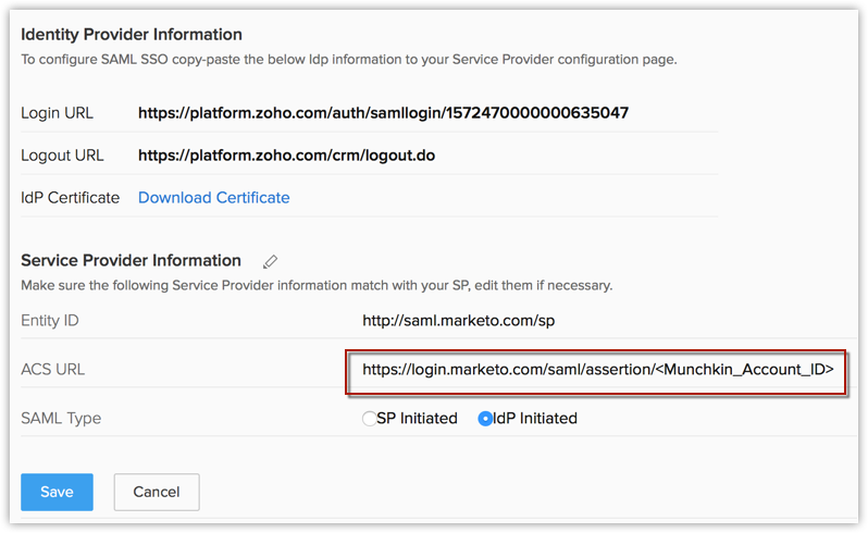 您必须为使用 Zoho CRM 的单点登录配置服务提供商和身份提供商设置。 在这里,Zoho CRM 担任身份提供商,这意味着您将能够使用 Zoho CRM 凭证登录您的 Marketo 账户。 为了让单点登录有效发挥作用,作为您的 Zoho CRM 系统组成部分的所有用户应该能够添加为您的 Marketo 账户中的用户。 否则,仅同时作为两类账户其中一部分的用户将能够实施 SSO。