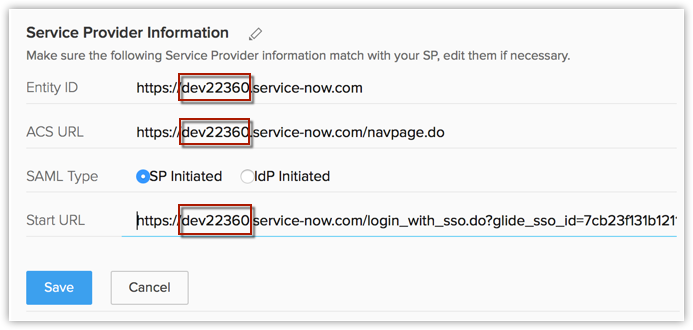 服务提供商详细信息部分中的静态值将在扩展详细信息中自动填充,但您必须提供需要的动态用户特定值。 例如,ServiceNow 的实体 ID 为: https:// <your instance >.service-now.com。 这里,< your instance >是用户特定值,必须从您的开发者实例中获取。