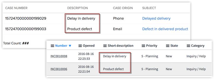 案例模块中创建的所有记录(配置数据集成设置之后)将自动同步到您的 ServiceNow 账户。 较早的记录无法集成。