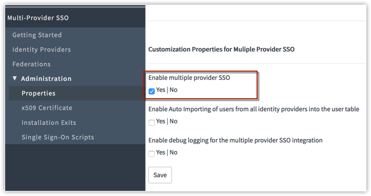 - 在多个提供商 SSO 属性页面,勾选 启用多个提供商 SSO 选框并点击 保存。