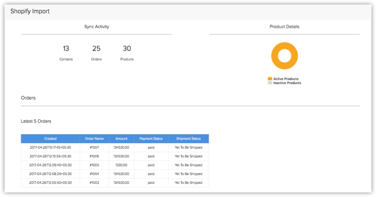 您的 Shopify 数据将被导入此模块。 所有详细信息在 Shopify 模块中分类为同步活动、产品详细信息和订单。