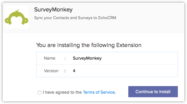 安装扩展并使用您的 SurveyMonkey 登录凭证进行身份验证是第一步。 一旦完成这一步,调查和联系人可同步。 安装之后,创建三个模块: SurveyMonkey、SurveyMonkey 详细信息和SurveyMonkey 回复。 您可以转到Zoho 市场并安装 SurveyMonkey 扩展或登录您的 Zoho CRM 账户并安装。