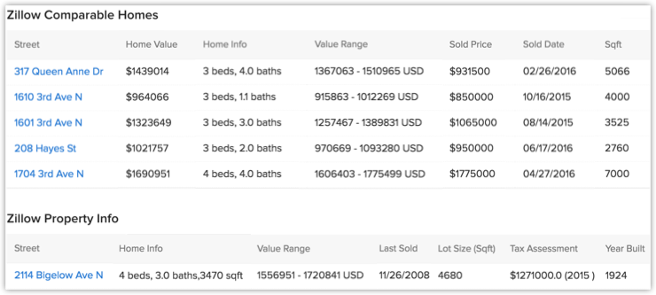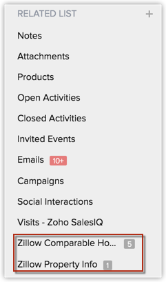 Zillow 根据输入的地址提供房屋价值估计结果 (Zestimate)。 利用 Zoho CRM 的 Zillow 扩展,您现在可以直接在线索和联系人详细信息页面查看房屋评估信息。 所有评估详细信息将出现在详细信息中,或者您可以选择使用 Zillow 选项卡搜索这些详细信息。
