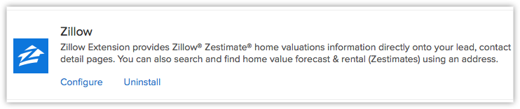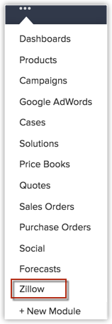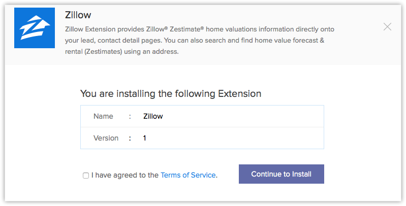 如需使用 Zillow 扩展,您将必须在您的 Zoho CRM 账户中安装。
