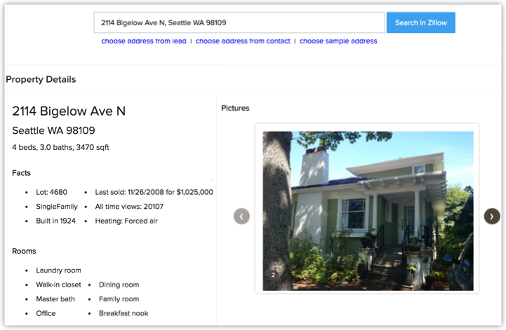 如需在线索和联系人的详细信息页面中查看 Zestimate,您只需更新记录中的相关地址信息。 一旦完成这一步,相关信息在记录详细信息页面中的 Zillow 可比较房屋和 Zillow 地产信息中自动更新。