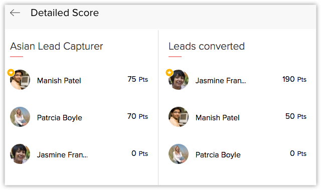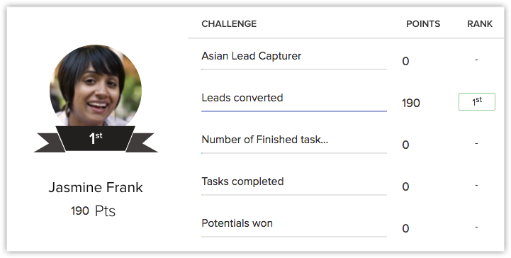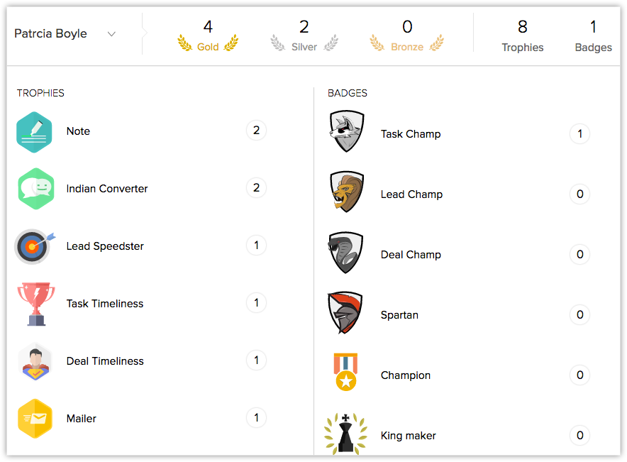 - 用户姓名 - 默认情况下,此页面显示目前登录 CRM 系统的用户的成就。 您可以通过从下拉列表中选择其它用户的姓名查看其成就。