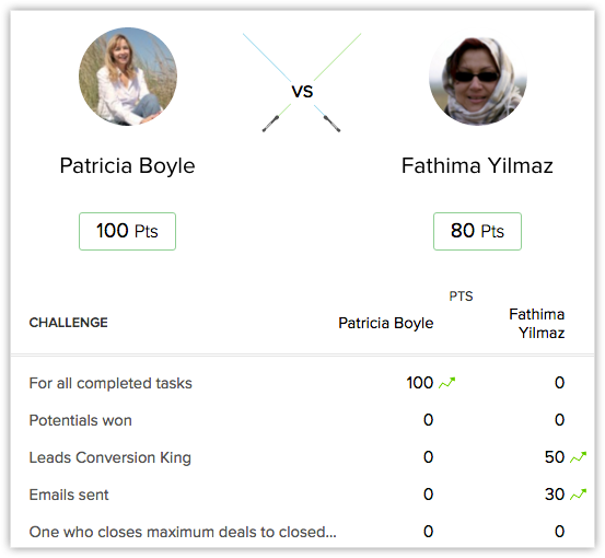 两个玩家 - 游戏仅涉及 2 个用户时,两个用户的总分将在同一页上显示,之后则是每个用户在每项挑战中取得的积分。 所有这些详细信息都在单独一页上显示。 积分旁边的绿色箭头表示用户在该项特定挑战中排名第一。
