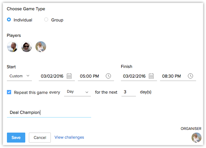 玩家在个人游戏中代表单个 CRM 用户,在团体游戏中代表团体。 - 开始- 这一字段用于表示游戏应该开始的时间。 下拉框中提供了三种选项
