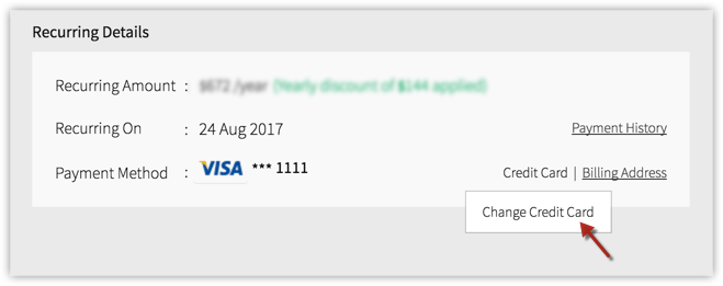 - 在 Zoho Store 页面的经常性付款详情部分下,点击信用卡。