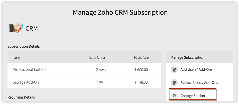 - 在 Zoho Store 页面中,根据需要点击升级用户/附加组件或降级用户/附加组件。