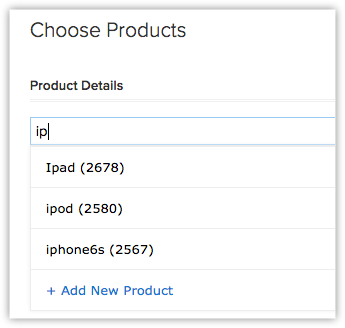- 在选择产品弹出页面中,键入产品名称或产品代码的一个特征用于搜索所需产品并从下拉列表中进行选择。 添加产品的唯一方式就是从下拉列表中进行选择。 您不可通过其它方式添加它们。 此外,搜索结果受到空格分割的单词影响。 例如,键入 "P" 会搜索出 "i pad",但前提是产品名称被存储为 "i pad"(作为两个单词)。 如果产品名称被存储为 "ipad",键入 "P" 不会搜索出该产品。 如需搜索出该产品,您必须键入 "i”。
