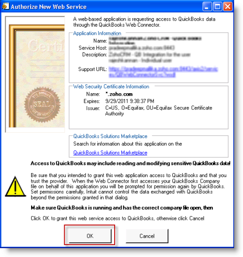 - 在验证新Web服务弹出窗口中浏览应用信息并点击确定连接QuickBooks与Zoho CRM