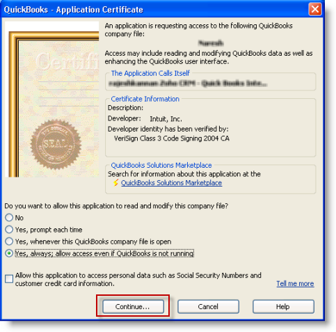 - 在QuickBooks –应用验证弹出窗口中选择是的,总是允许即使QuickBooks未运行,这是必选项。
