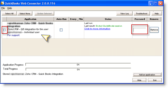- 查看Zoho CRM - QWC应用状态,选择应用的复选框并输入密码