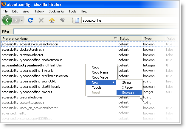 - 打开Firefox浏览器并在地址栏中输入about:config