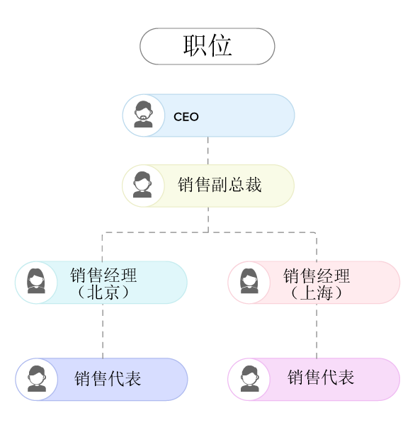 职位层级 - 在此结构中,对用户数据的访问权基于职位。具有较高层级的用户可查看下属职位的用户的数据。例如,Zylker Inc. 遵循以下层级结构:CEO 或管理员可查看整个机构的数据。而且,销售经理可查看所有销售主管的数据。另请参阅管理职位。