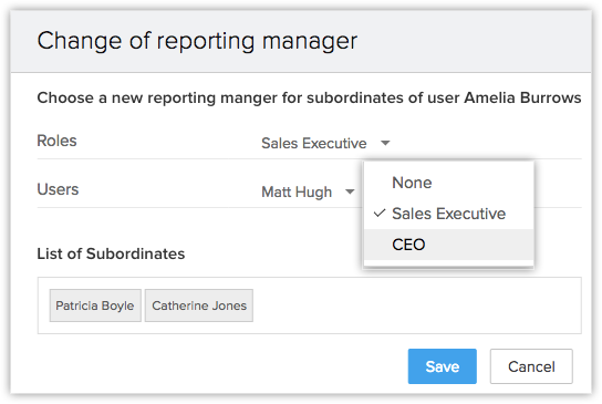 在商业场合中,很多业务都需要上级批准才能完成活动。Zoho CRM允许您将这些活动上报给记录所有者的上级。在报告层级中,您可以选择记录所有者的上报经理来执行这些操作。下面列出报告层级带来显著影响的一些功能实例: