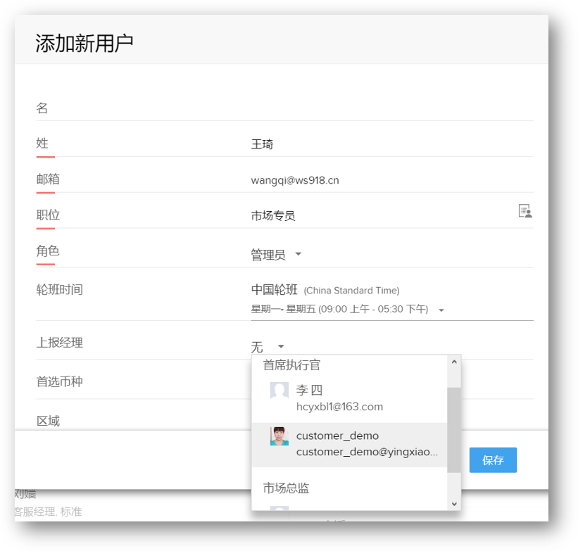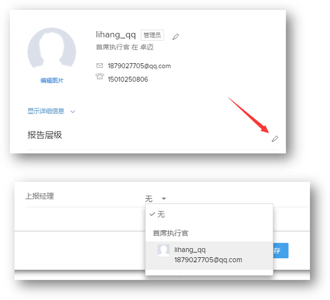 为机构定义报告层级结构之后,就可以为用户选择上报经理。职位高于该用户的任何用户都可以被选为该用户的上报经理。