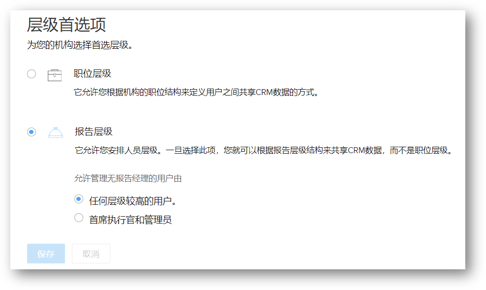 在 Zoho CRM 的报告层级中,您可以根据职位设置机构的层级结构,也可以向用户分配上报经理以实现严谨的记录可访问性。在此层级结构中,某个用户被分配了一个有权查看或访问其数据的上报经理。职位高于该用户的任何成员都可以被选为上报经理。而且,您可以选择机构的非报告成员是由任何具有更高职位的上级管理,还是由管理员和超级管理员管理。此结构将确保机构内的信息访问受到控制,并可确定一个用户只有一个上报经理。