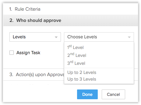 设置审批者时,可选择级别以定义此任务必须在第 1 层级、第 2 层级还是第 3 层级进行审批。其次,还可以选择审批时是否需要第 2 层级和第 3 层级的所有成员参与。