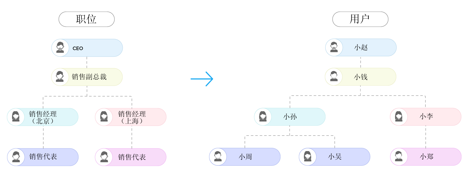 在以下A公司的机构模型中,首席执行官小赵具有管理职位,可访问整个机构的数据。小孙和小李分别是北京和上海分部的销售经理。根据此层级结构,销售代表向销售经理报告。因此,小周和小吴向小孙报告,小郑向小李报告。而且,销售副总裁小钱在机构中是非报告成员,小赵可访问他的数据。