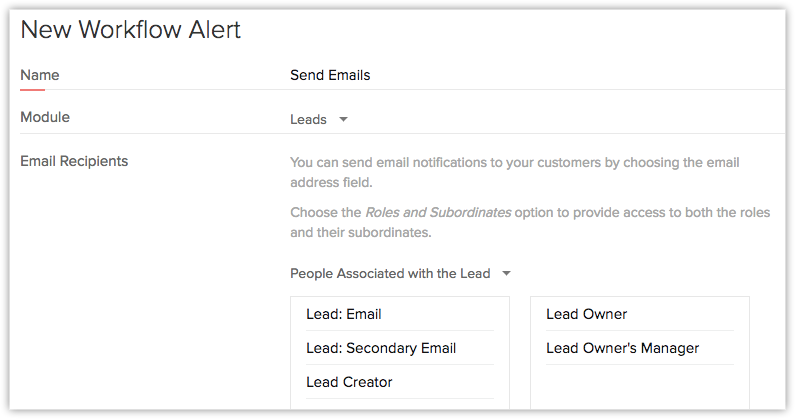 Zoho CRM允许您创建一组操作来自动完成销售和市场营销活动。还可以使这些操作与工作流规则、蓝图及审批流程相关联。可以直接与报告层级关联的操作之一是发送提醒。可以使提醒与工作流规则相关联,以便在触发规则时将所选电子邮件自动发送给收件人。在报告层级中,您可以选择记录所有者的上报经理作为收件人之一。
