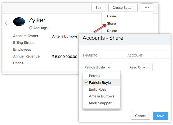 CRM记录仅可供记录所有者和其在同一部门的上级查看和访问。报告层级允许您从其他部门中选择您要与其共享数据的成员。可将权限设置为读/写或只读。