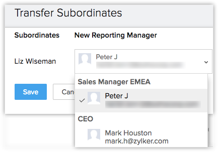- 在转移下属弹出窗口中,从下拉列表中选择新的上报经理。