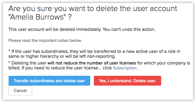管理员可以从 CRM 帐户中删除用户。删除用户时,您需要记住两点: